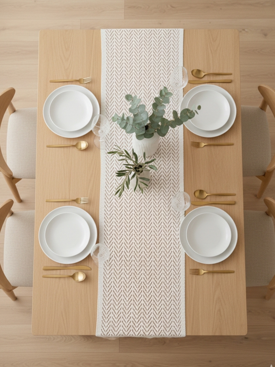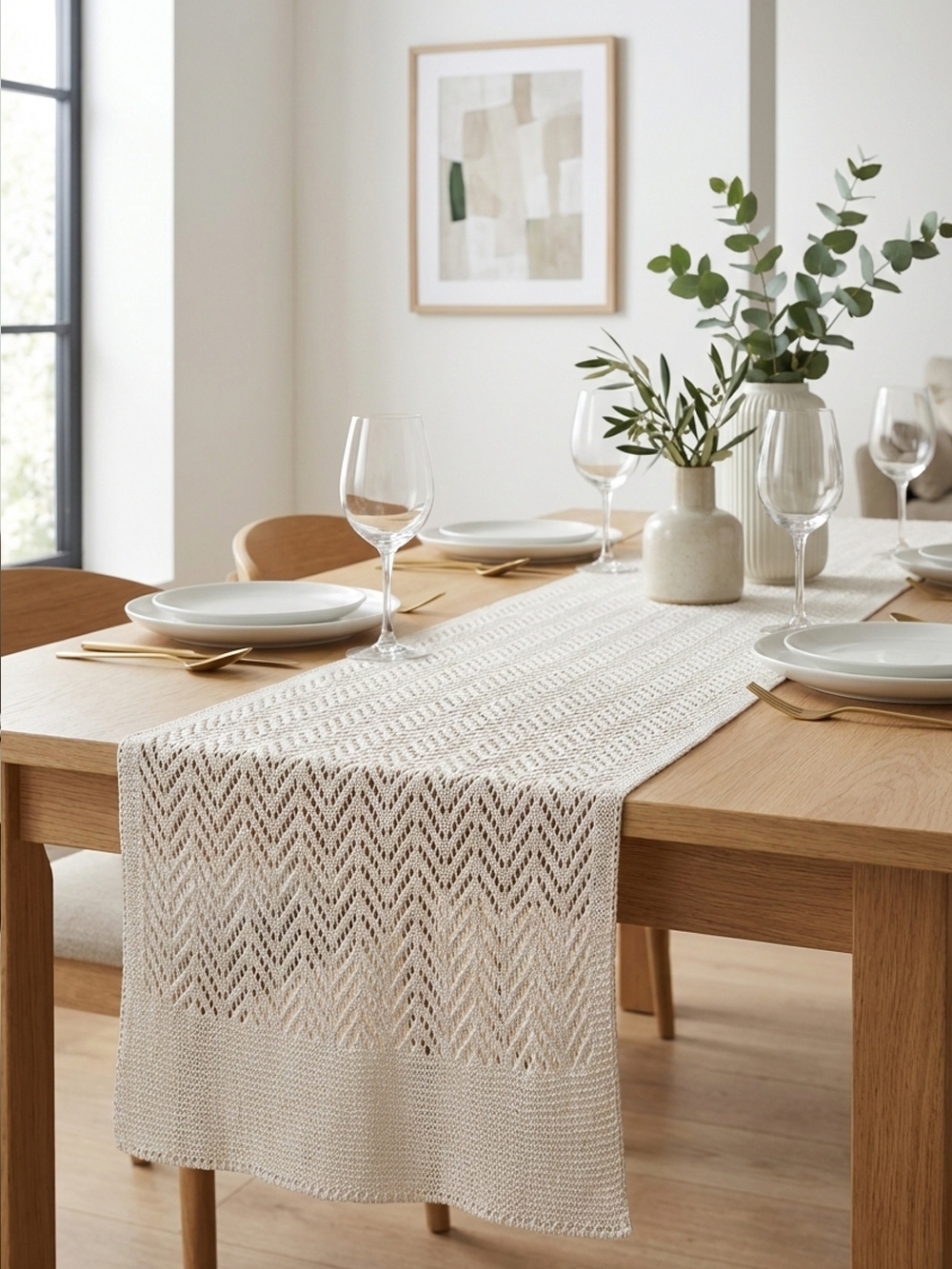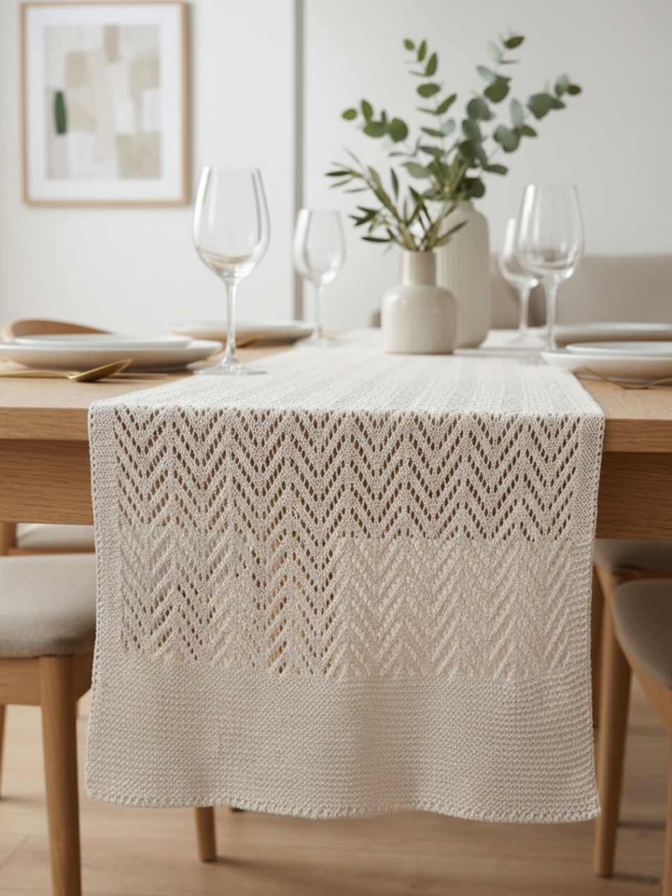 Идеальное решение для магазинов домашнего декора и интерьерных студий. Вязаный ранер с узором «шеврон» в нейтральном бежевом цвете — это базовый элемент коллекции в стиле Scandi или Hygge.