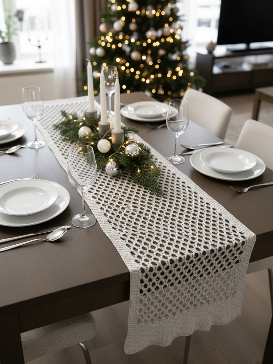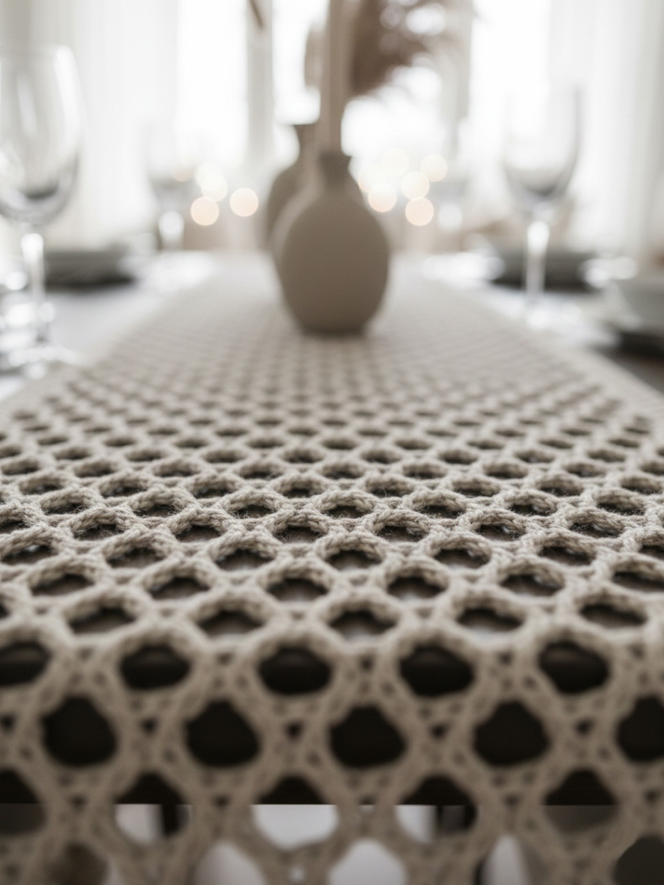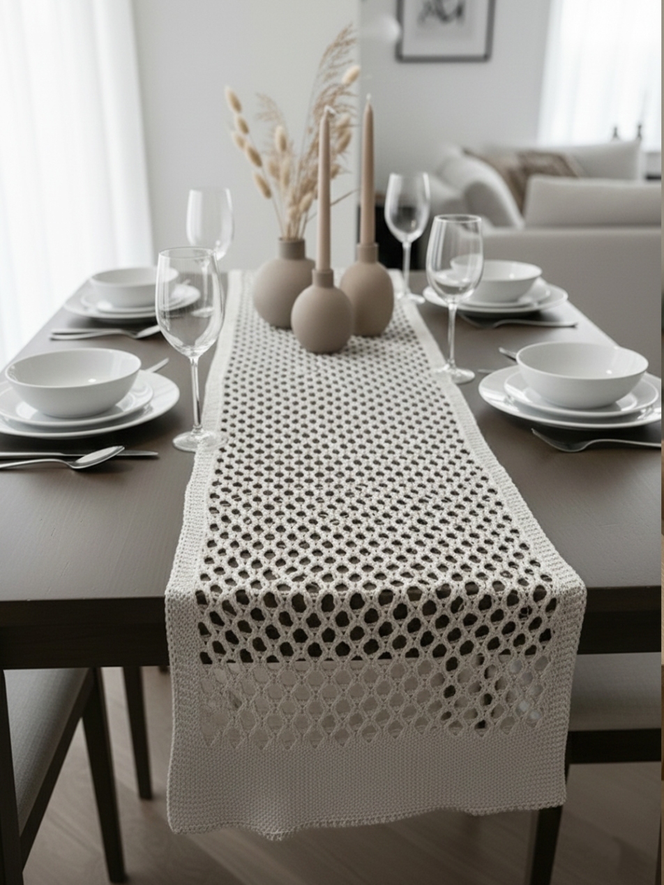 Лаконичные бежевые дорожки для современных пространств. Благодаря сетчатой структуре и теплому оттенку, эти ранеры идеально подходят для оформления столов в офисах, коворкингах и кафе в стиле лофт.