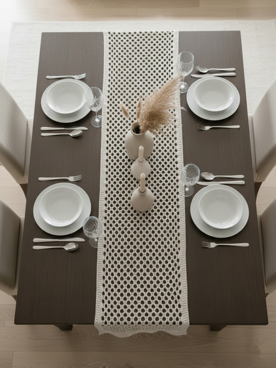 Лаконичные бежевые дорожки для современных пространств. Благодаря сетчатой структуре и теплому оттенку, эти ранеры идеально подходят для оформления столов в офисах, коворкингах и кафе в стиле лофт.